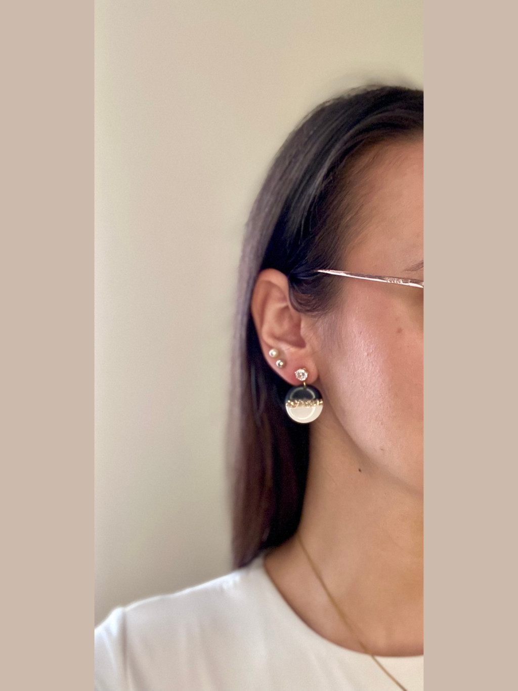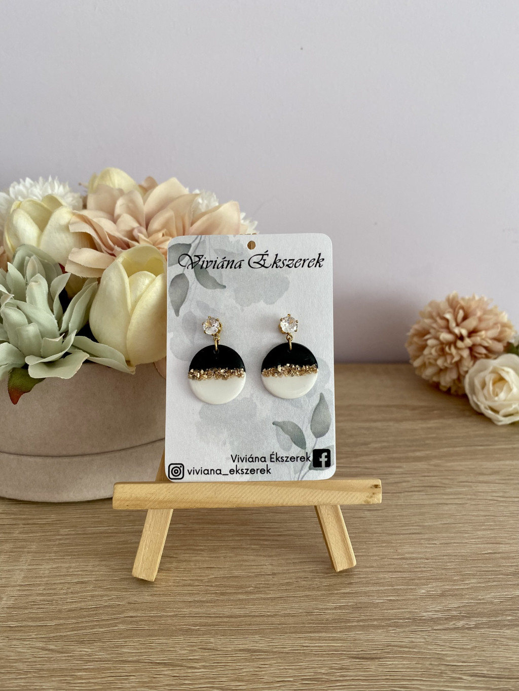 A fülbevaló fekete és fehér színű süthető gyurmából készült, a közepén arany színű kövekkel van díszítve.