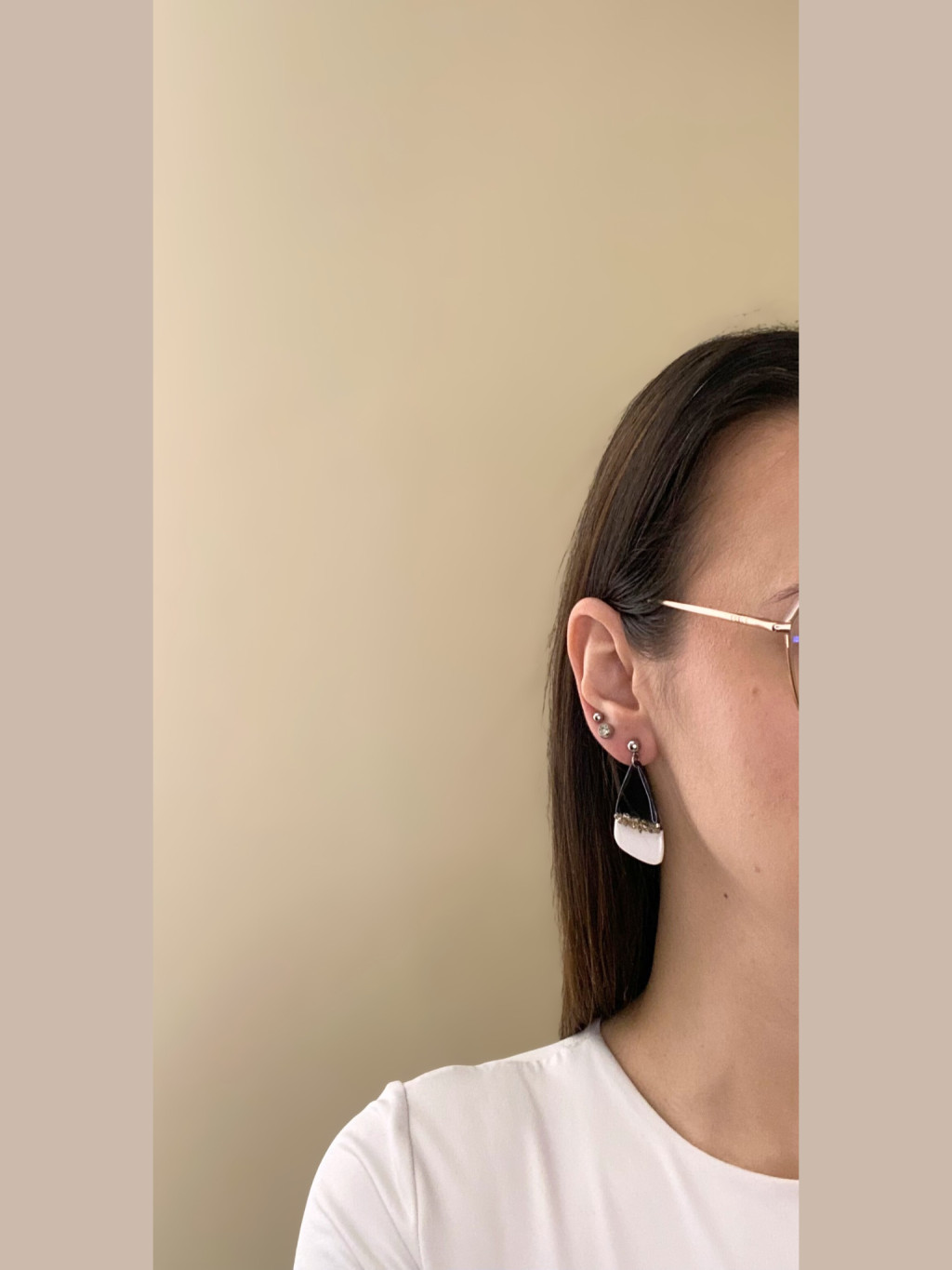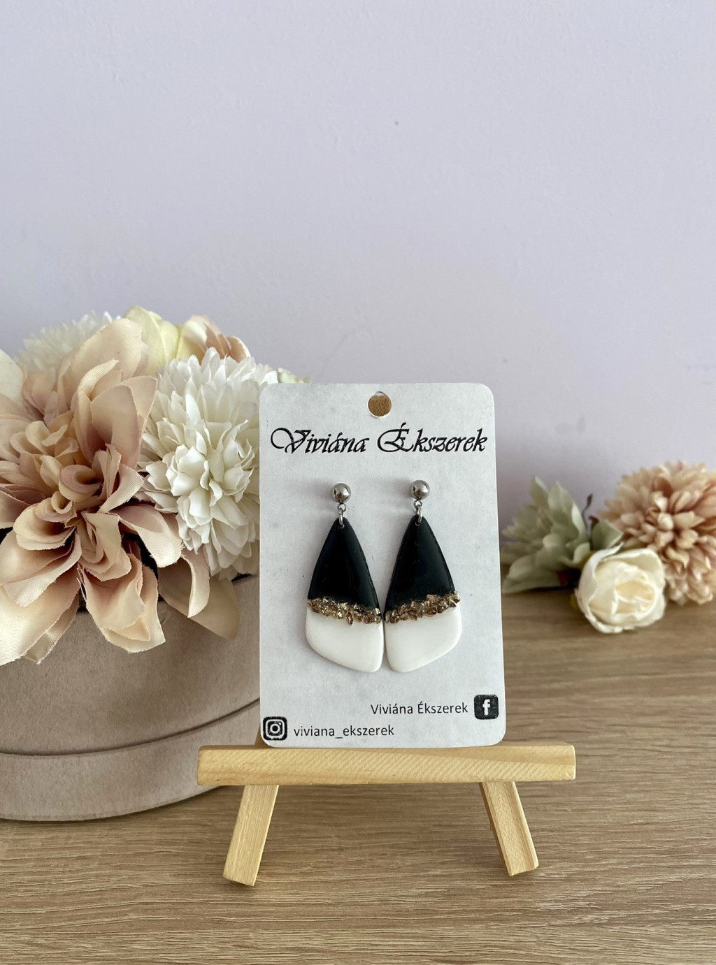 A fülbevaló fekete és fehér színű süthető gyurmából készült, a közepén ezüst színű kövekkel van díszítve.