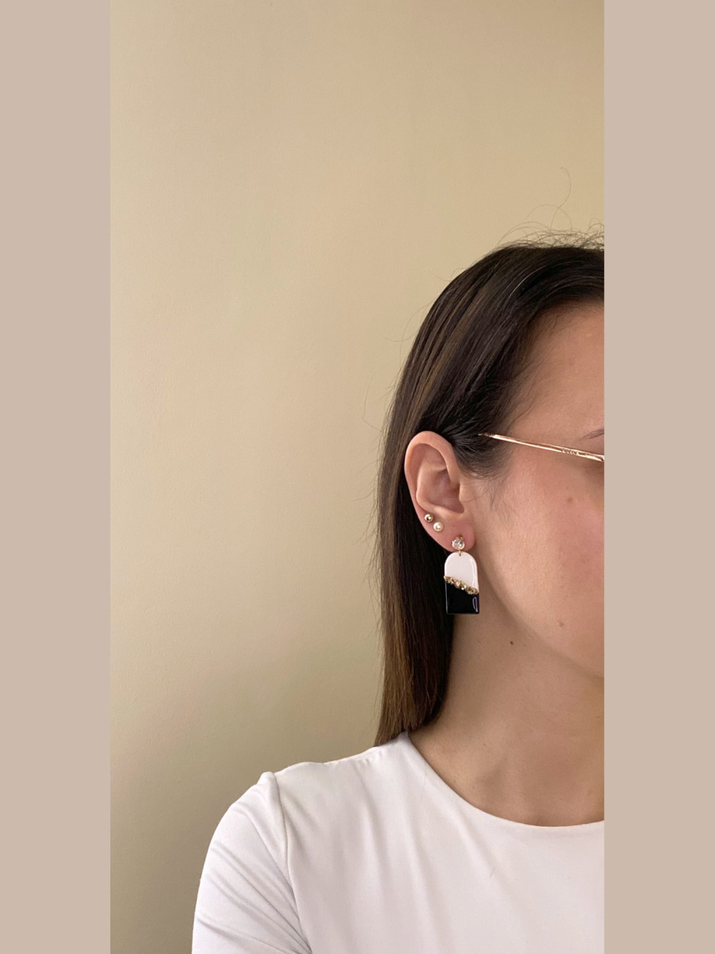 RÁHEL - Fehér-fekete fülbevaló, arany kövekkel díszítve, arany színű szerelékekkel